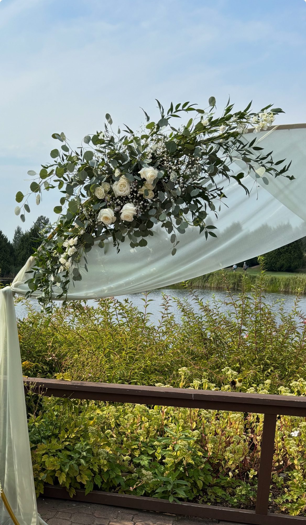 Create a breathtaking focal point for your ceremony with our elegant floral arch piece. This listing is for a single arch piece, designed with a harmonious blend of premium blooms and lush greenery, adding romance and grandeur to any wedding. Perfect for framing your vows or creating a stunning photo backdrop.