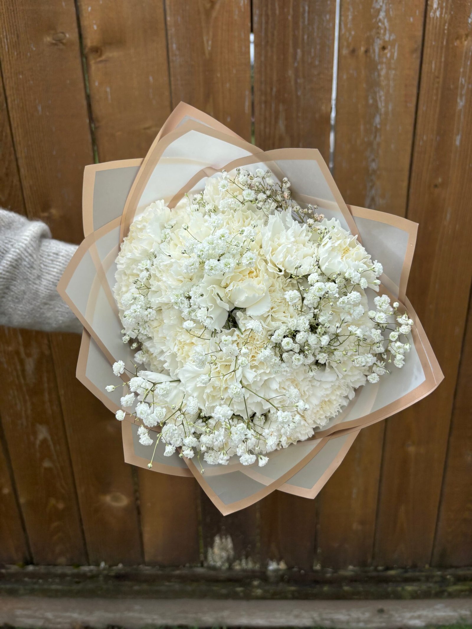 Snowfall captures the quiet beauty of a winter morning. Featuring pure white carnations and delicate baby’s breath, this bouquet brings a touch of calm sophistication to any space. It’s the perfect choice for thank-you gestures, sympathy flowers, or simply brightening a minimalist home.